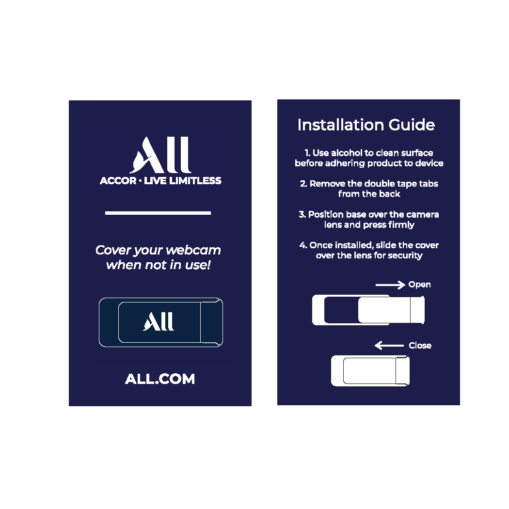 This ultra-thin webcam cover protects your security and privacy and prevents webcam spying. Simply place your finger on the disc and slide your finger to hide and unhide your web camera. The ALL logo is printed on the webcover. It comes on a printed backcard with instruction.